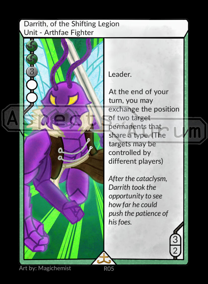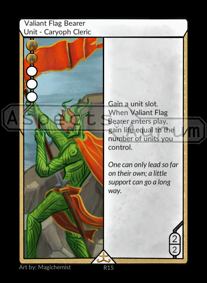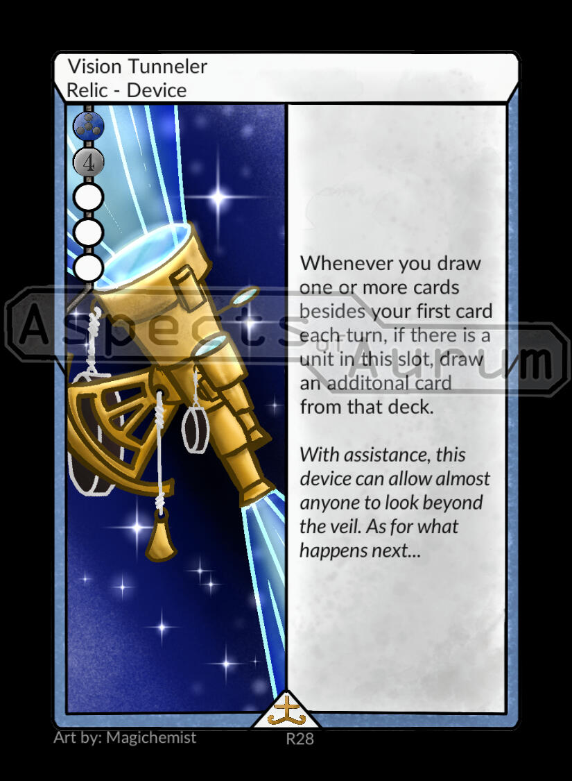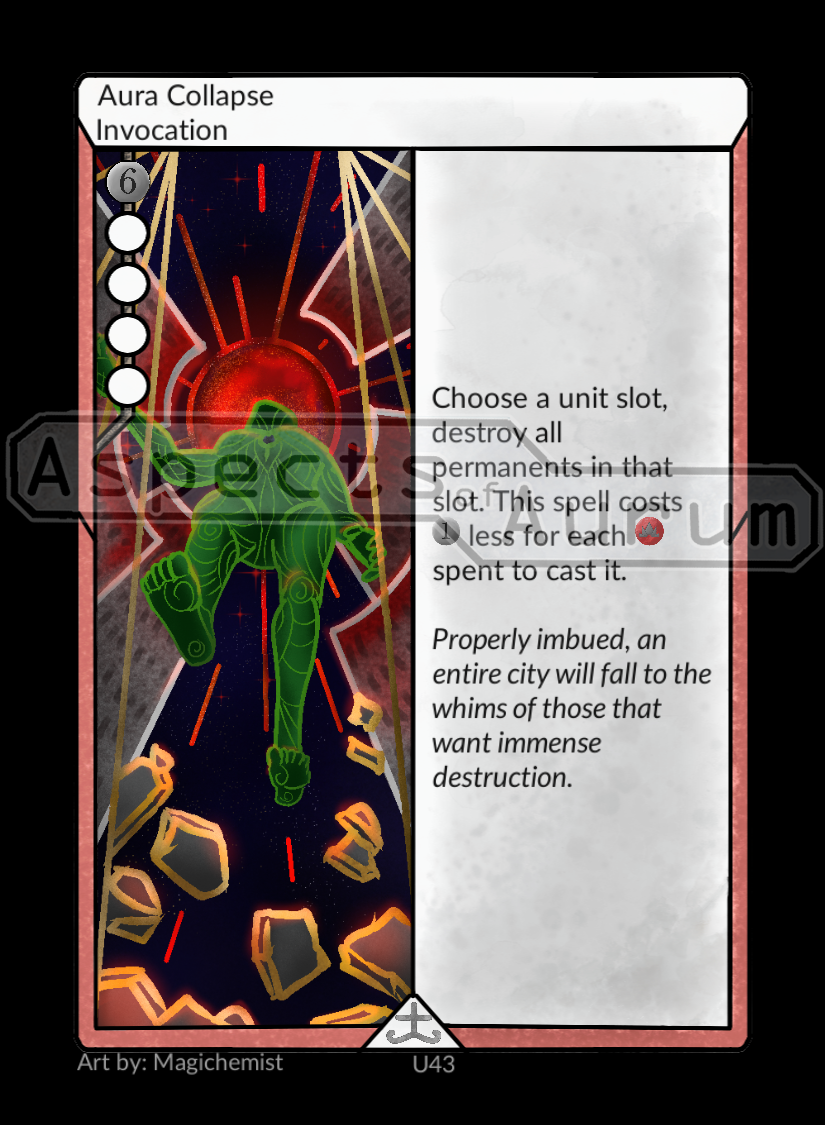 Aspects of Aurum is a custom trading card game created by Magichemist, an indie creator versed in game design and digital art. This game aims to create a unique play experience while also allowing its players to have a direct input on how the game develops overtime.Use your resources to build an army and take command of the undiscovered wilds. Excavate ancient relics lost to time to direct your troops to victory. The wilds are ripe with ancient history waiting to be rediscovered.